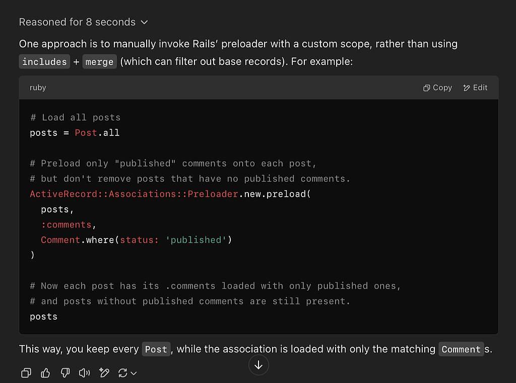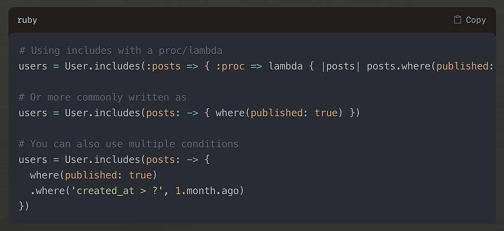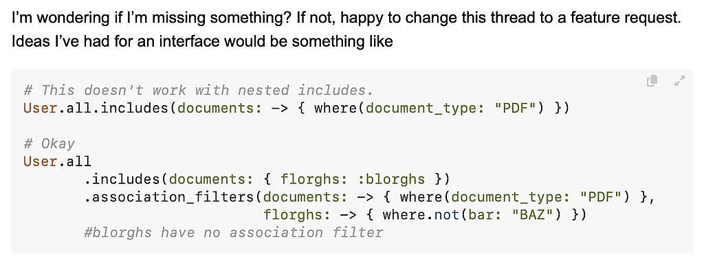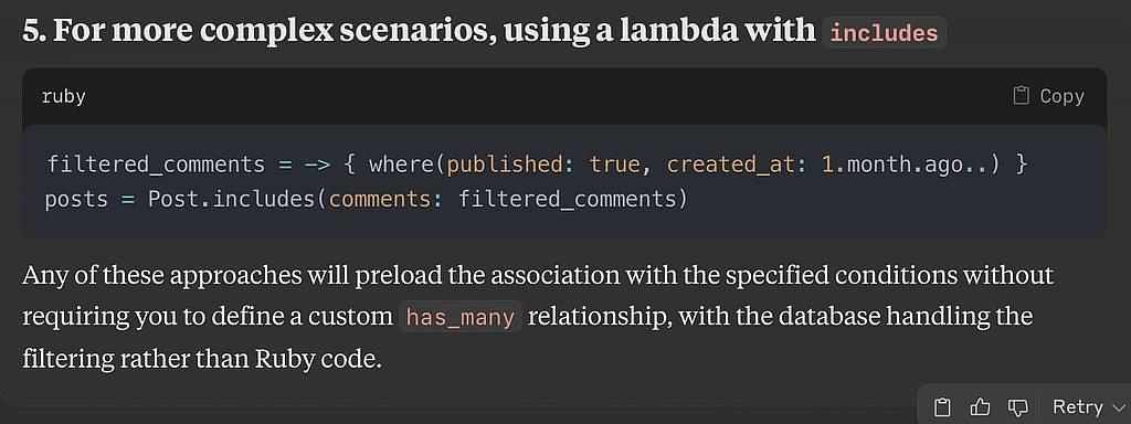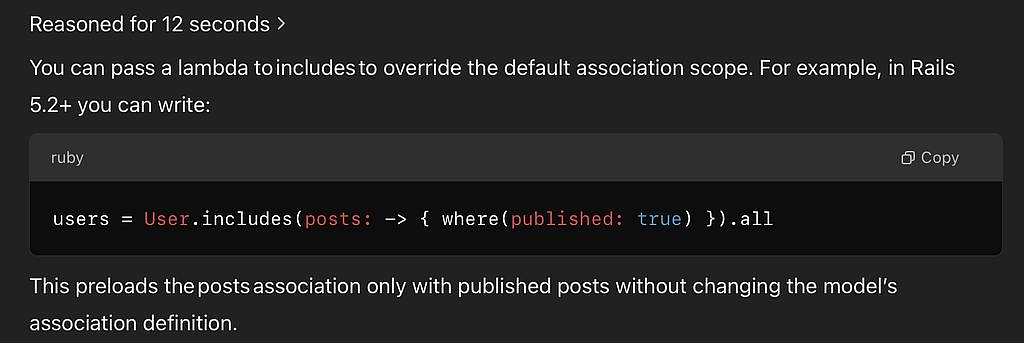 User.includes(investments: -> { where(state: :draft) })...This is not a feature of ActiveRecord or any libraries that I'm aware of. I asked him why he thought this was valid syntax, and he pulled up his ChatGPT history. It looked something like this: